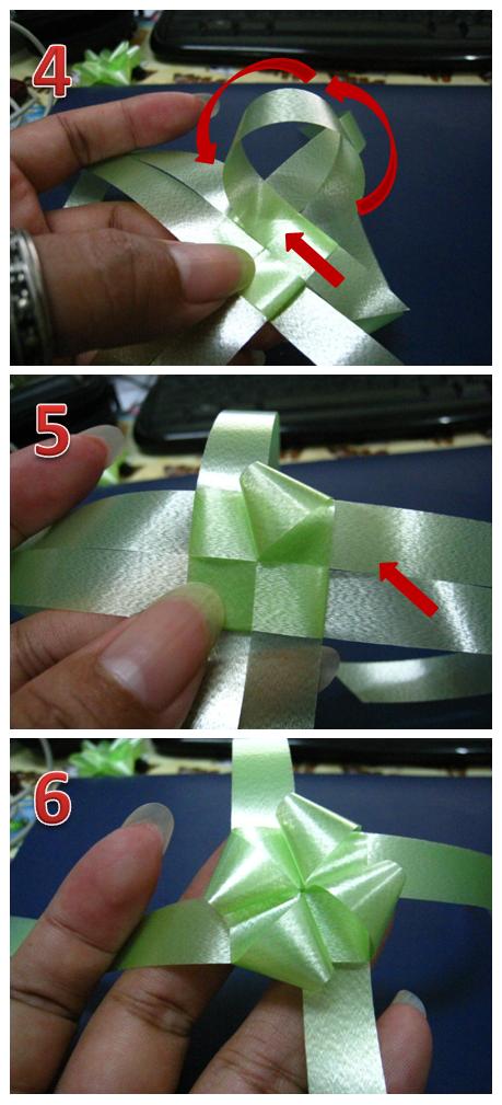 3. พับริบบิ้นเส้นขวาเข้ามาด้านในตามรูปที่ 4 แล้วพลิกบิดกลับไปสอดใต้เส้นตรงกลางตามรูปที่ 5 ดึงให้ตึงจะออกมาตามรูปที่ 6