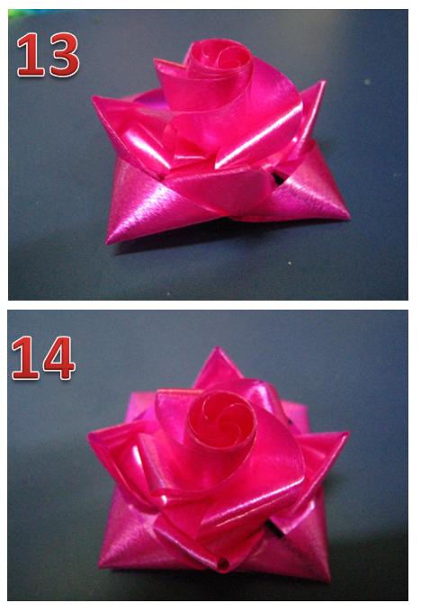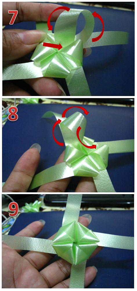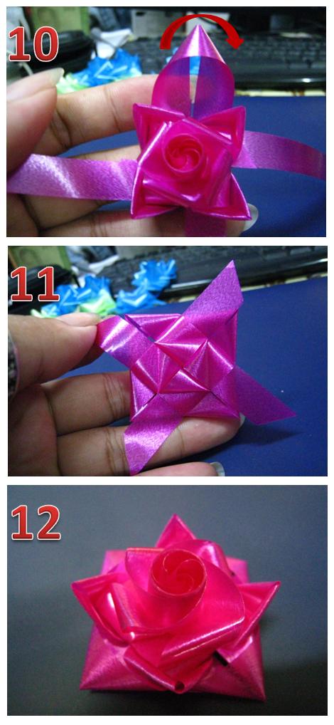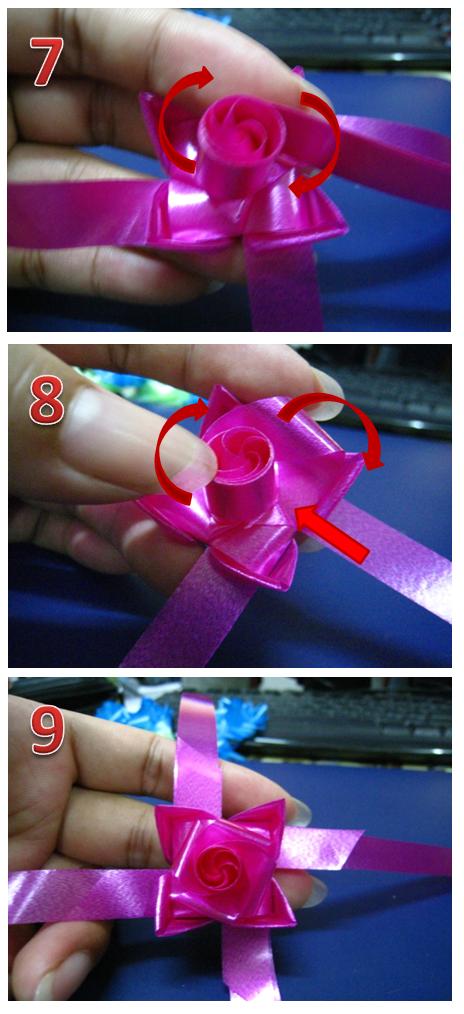 6. พับกลีบใน โดยใช้ปลายริบบิ้นที่สอดมาพับกลับเข้ามาตรงกลางตามรูปที่ 8 แล้วพลิกบิดมือตามรูปที่ 9 แล้วสอดไปใต้กลีบถัดมา ดึงให้กึ่งตึง อย่าให้ตึงมาก