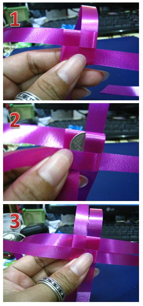 1. ตัดริบบิ้นมาละ 4 เส้นแล้วมาพับกลางทั้ง 4 เส้น พับแบบพับทั่วไปจะออกมาตามรูปที่ 1 แต่ต้องให้เส้นล่างสั้นกว่านะ